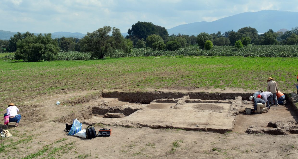 Figure caption: Excavations in 2014 of Tlajinga Compound 18:S3E1, Teotihuacan, with pyramids visible in the distance. Photo by David M. Carballo.