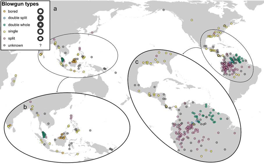 Here, we used a classification system proposed for South American blowguns and extended it for use in a world sample that was gathered from literature searches (including those in the eHRAF World Cultures database) and own collection-based work (as shown below). We mostly obtained data on which societies (ethnologically speaking) use blowguns, which types of blowguns and projectiles they use and to increase interoperability with other databases out there, we linked our ethnological information to language units (‘languoids’) available in the Glottolog database. Our results indicate that the geographic distribution of blowguns cannot be explained by a single factor, all types of blowguns are seen in distant parts of the world, and geographic closeness and cultural connections certainly play a role. A case-study on the use of blowguns in groups of Austronesian language speakers shows clade-specific preferences across the tree. In terms of projectile use, the darts are by far more frequent and only exclusively used in the ‘double-whole’ type of blowguns; pellets are more likely to be used in ‘single’ type blowguns than all the other types.